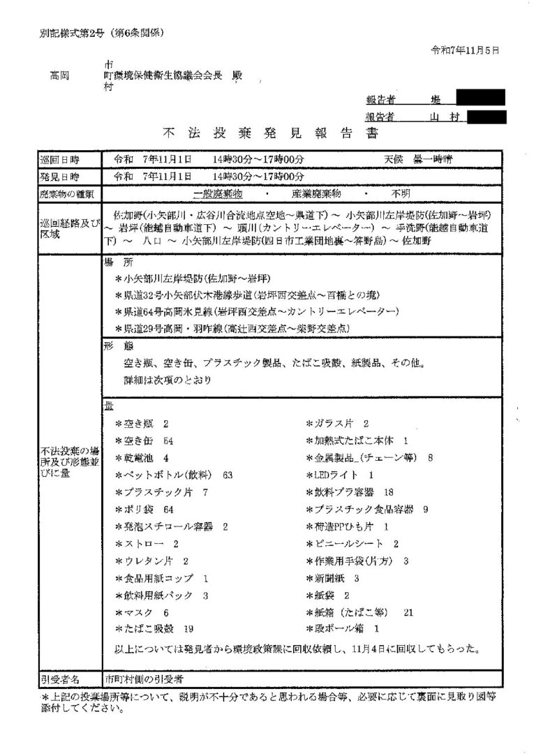 高岡市の佐加野地区で11月1日に小矢部川沿いで行われた環境巡視員活動の報告が届きましたので掲載します。 数多くのごみが回収されました。 お疲れ様でした。